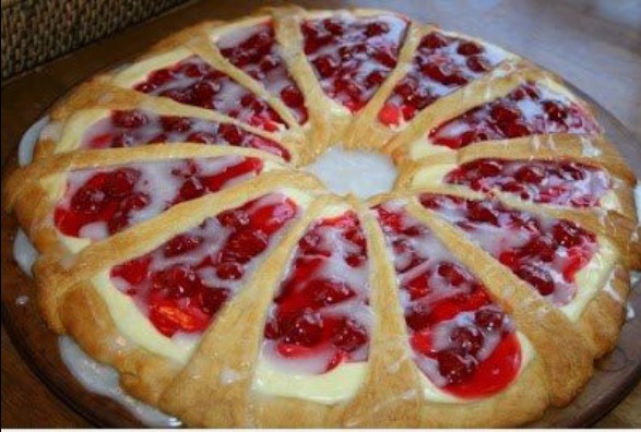 - Add 1 can of cherries over cream cheese mixture. Make sure not to get any in the middle in that hole you just cut!